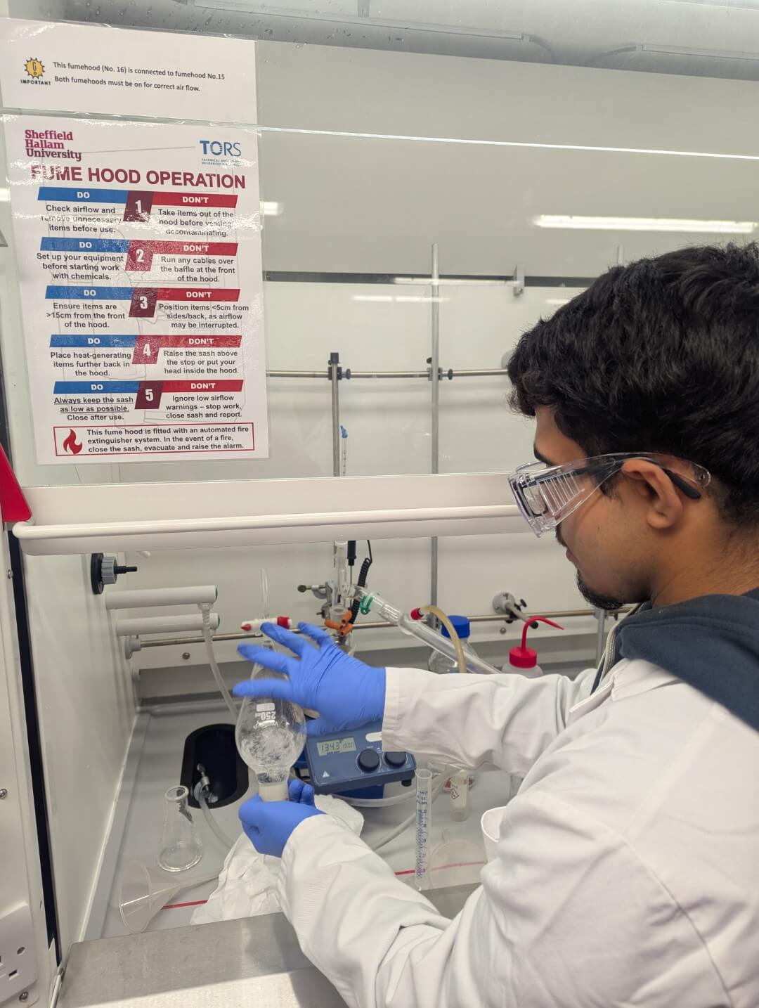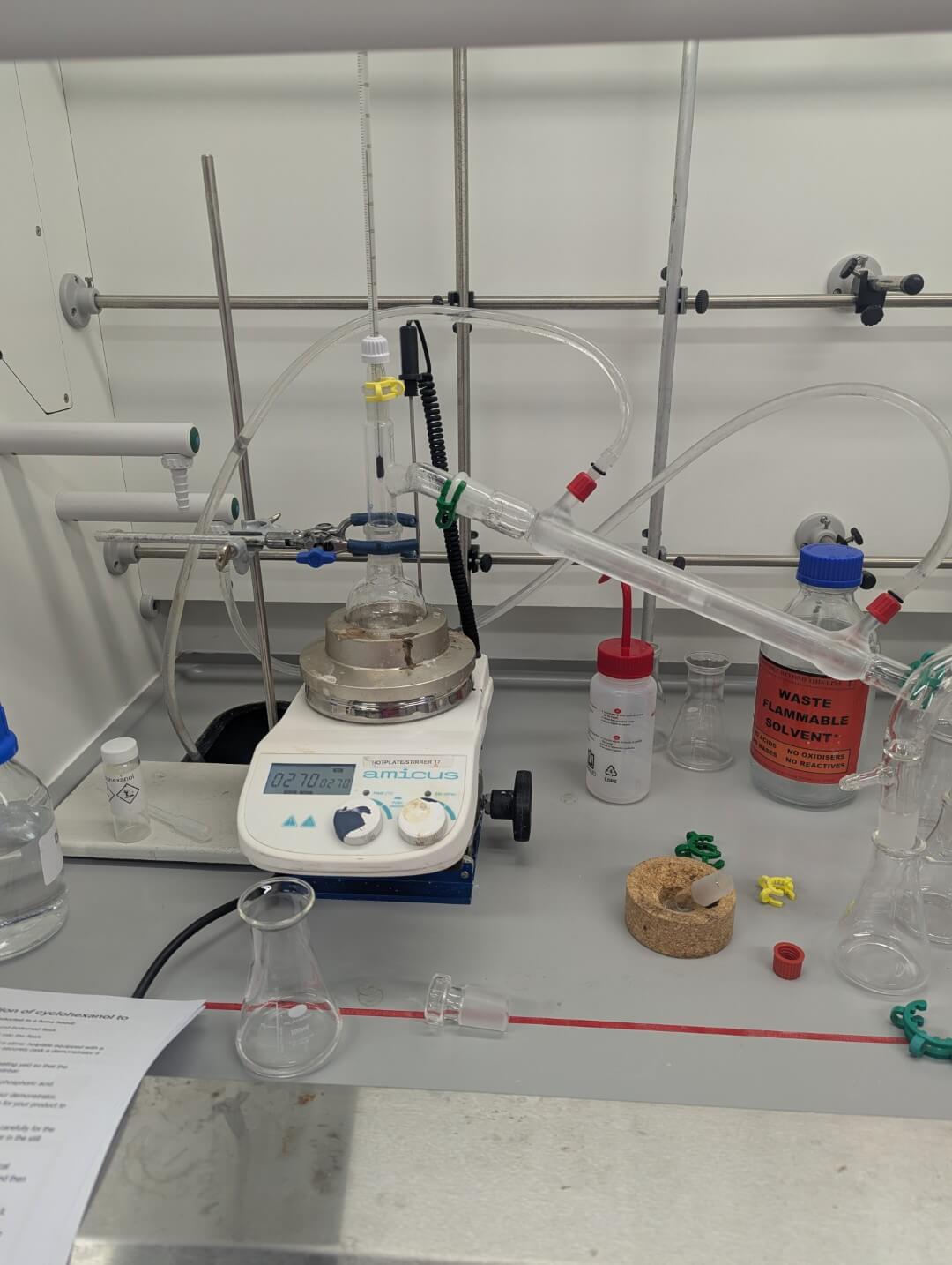 Recently, Year 13 Chemistry students visited Sheffield Hallam University to synthesise, purify and analyse cyclohexene as part of their practical endorsement. This gave students the opportunity to carry out the synthesis of an organic liquid using university-grade equipment, including individual fume cupboards, stirrer hot plates, and IR and NMR machines.